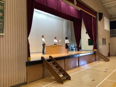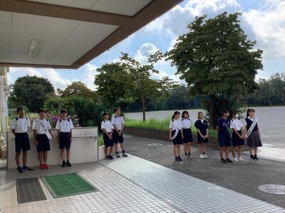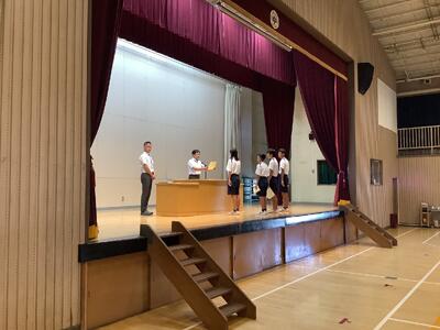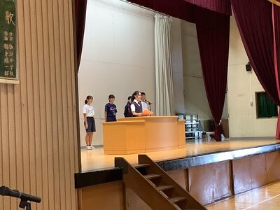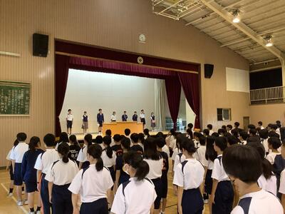 前期生徒会による最後の生徒会朝礼が行われました。各委員長から全校生徒に向けて依頼や連絡が伝えられ、また、テニス部•バドミントン部•柔道の表彰がありました。