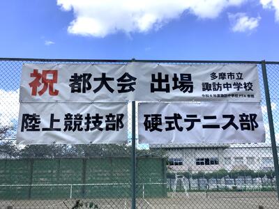 この度、予選を見事突破して、テニス部が都大会への切符を手にしました。今年度、陸上部に引き続いての快挙です。早速、PTAから都大会出場を祝い、横断幕が贈られました。14日からの都大会では、またいい結果が出ることを祈っています。
