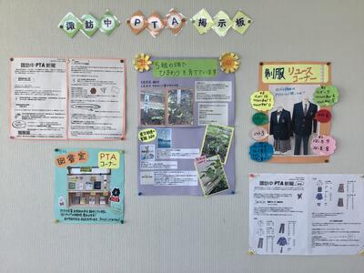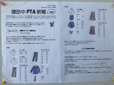 4階のPTA室の前の廊下にはPATの掲示板があり、様々な情報が載せられています。今回、PTA新聞として細やかに制服等のリサイクル情報を提供してくださいました。