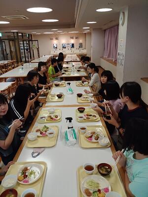 部屋で自由時間を過ごして、夕食になりました。お昼が早かったので、みんなよくお箸が進んでいます。