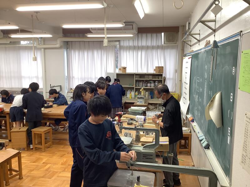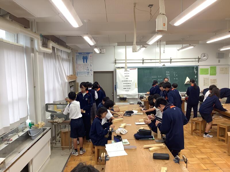 1年生の技術科の授業では、木工作品の制作が行われています。硬い材質の木材に苦労しながらも、電動糸のこ•電動ドリル•やすりなどを使いながら、木製ハンガーの完成に向けて楽しみながら作成していました。