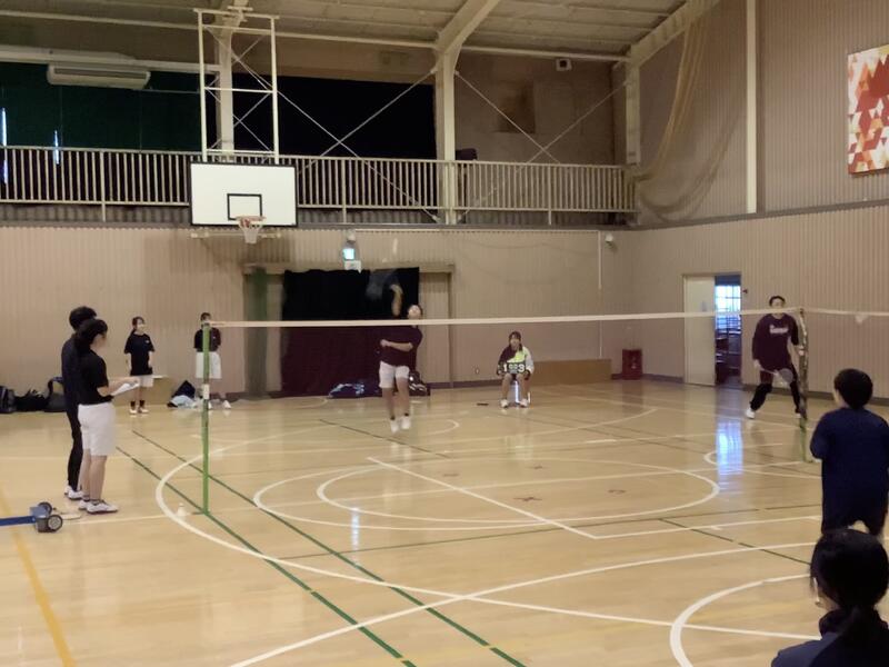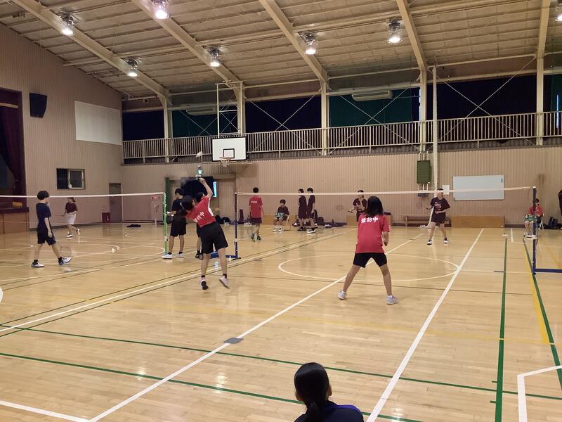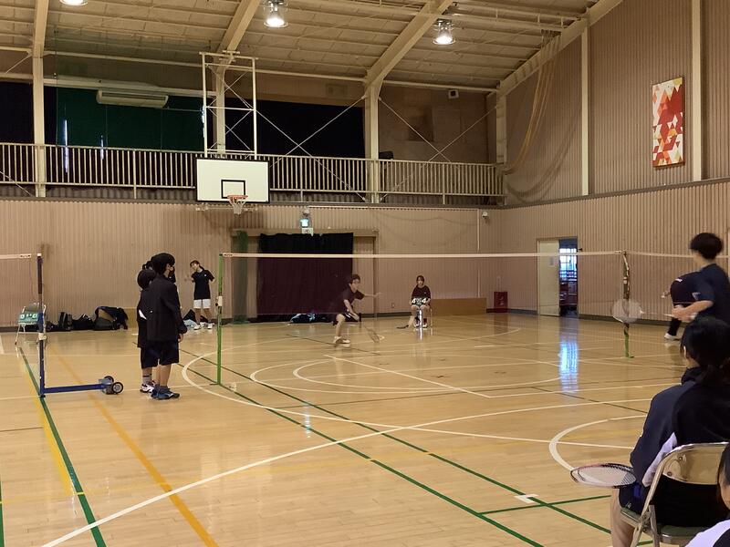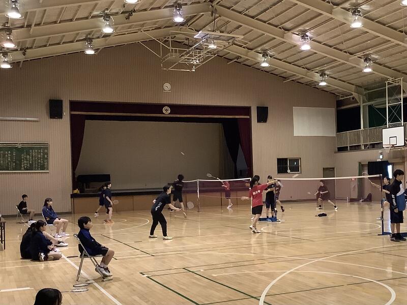 バドミントン部が鶴牧中を招いて練習試合を行っていました。双方の先生方やコーチの方のアドバイスを受けながら、何試合もこなしていました。武藤先生もリザーバーとして、コートに入っていました。