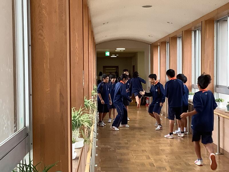 あいにくの雨で、校庭の部活動(陸上部とテニス部)は校舎内でそれぞれ工夫した練習を行っていました。