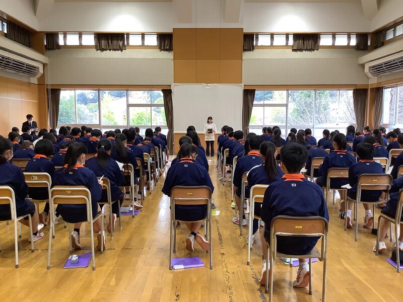 2年生は明日から3日間の職場体験学習が始まります。今日は学年がホールに集まって、しおりをもとに最終確認が行われました。明日からの体験を前に、先生方の話に真剣に耳を傾けていました。