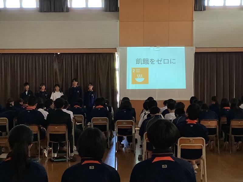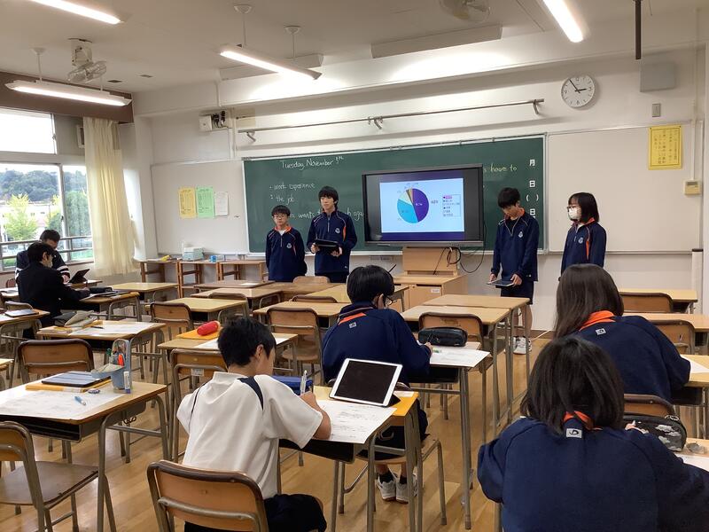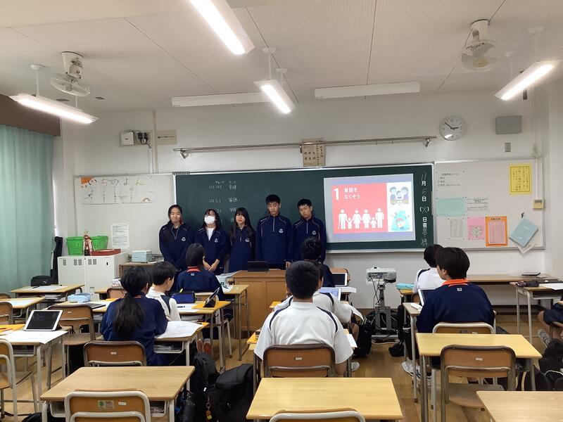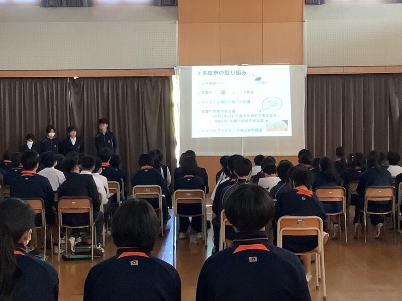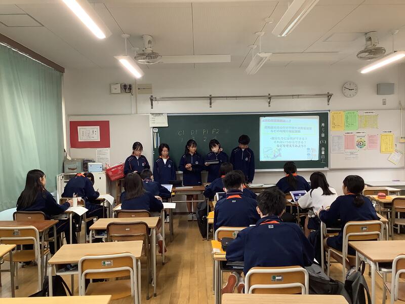 5日に行われたグループ内の発表で選ばれた代表グループが、学年全体の前で発表を行いました。どのグループも、工夫されたスライドを用いて、堂々とした態度でわかりやすく伝えることができていました。発表においては、SDGsの17の目標のうちのひとつを選び、深く探究し、しっかりと考察を行った上で、多摩市への提言や学年への呼びかけがなされていました。