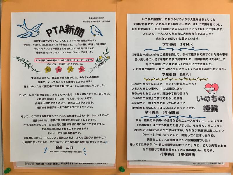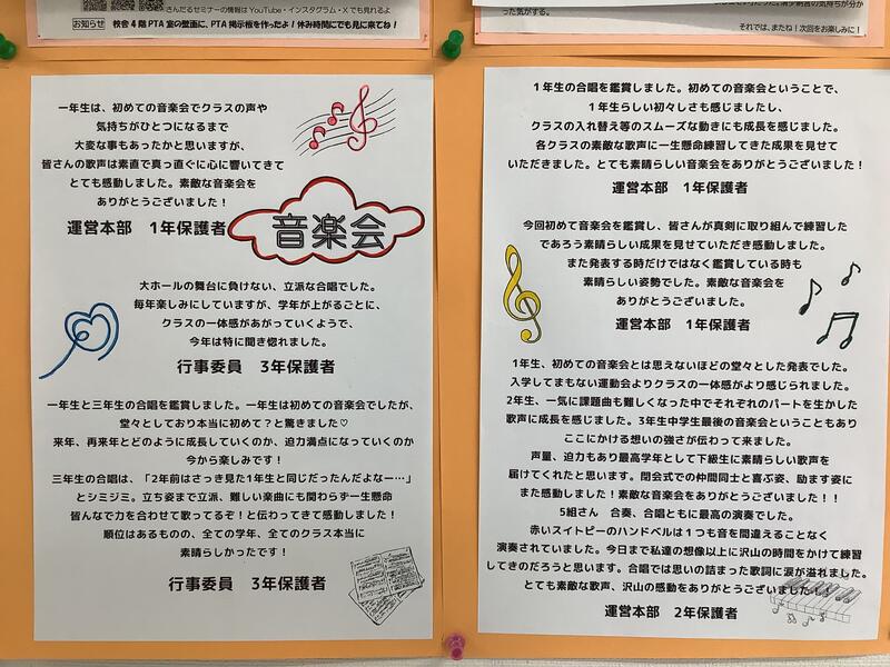 これまでPTA室前の掲示板に貼ってあったPTA関連の掲示物を1階の廊下に移しました。これまでは、4階の1番奥にあったため目につきにくくなっていましたが、今回の変更によって、より多くの方々に見ていただくことができるのではないかと思います。今回、原稿をお寄せいただいた保護者の皆様、どうもありがとうございました。