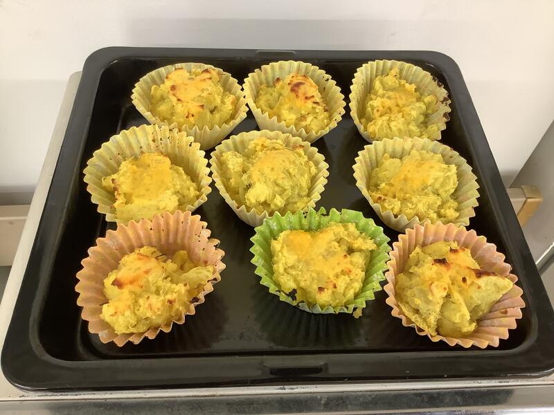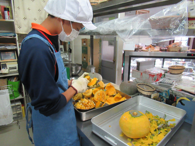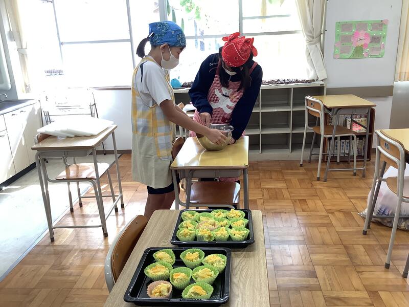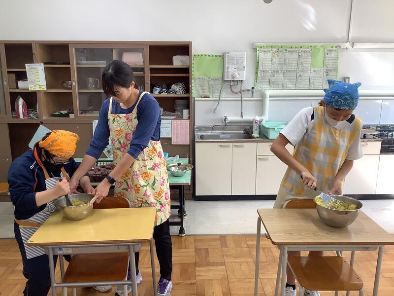 畑で採れたサツマイモを使ってスイートポテト作りをしました。工程ごとに役割を分担しながら、全員で協力して作り上げました。皆それぞれに割り当てられた作業を、集中して黙々とこなしていました。今回は、アイスクリームを入れるという秘伝のレシピによるもので、とてもおいしく出来上がっていました。
