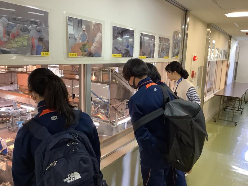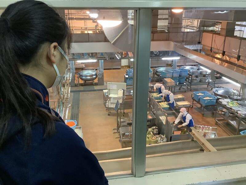 5組の1年生が学校給食センターに出かけました。施設の方から説明を受けながら、働いている人の様子や給食が作られていく様子について、興味深く見学していました。