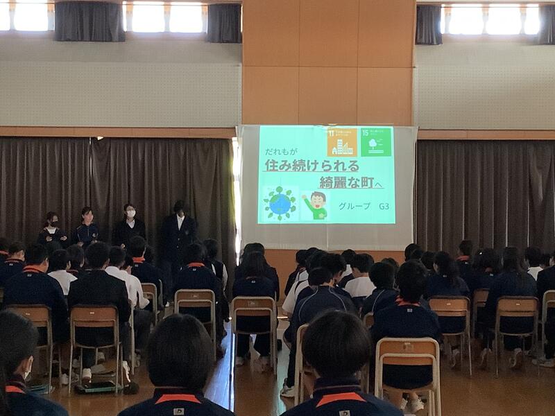 2年生が11月6日からの3日間で行った職場体験についてグループごとに発表を行いました。実際に体験したことたや感じたことに加え、SDGsの視点から各事業所が取り組んでいることについてレポートしたことを発表し、お互いに評価し合いました。職場体験後には期末考査もあり、大変短い期間でのまとめ作業にもかかわらず、どの班もよく工夫された映像資料を作ってわかりやすく伝えることができていました。2年生の大きな成長を感じることができました。