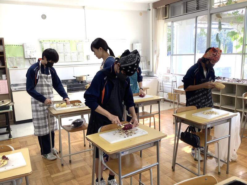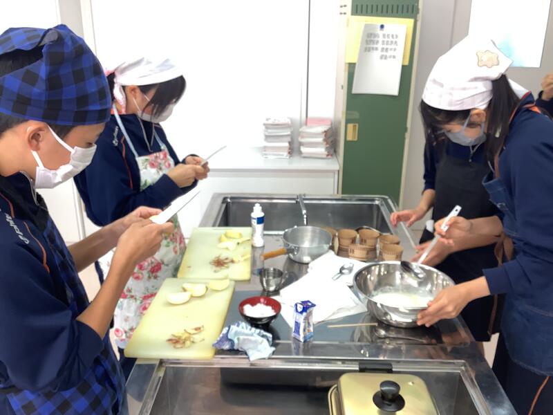 3年生の家庭科では、蒸しパンとリンゴのコンポートを作っていました。1時間という限られた時間の中で、男女よく協力して、とても楽しげに調理実習を進めていました。