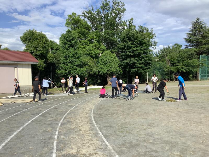 明日の運動会のために係活動と準備が行われました。校庭では、ライン引きやテント設営、得点板の設置などが行われました。