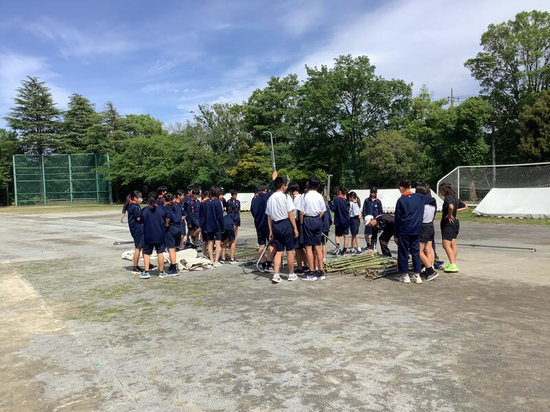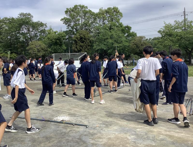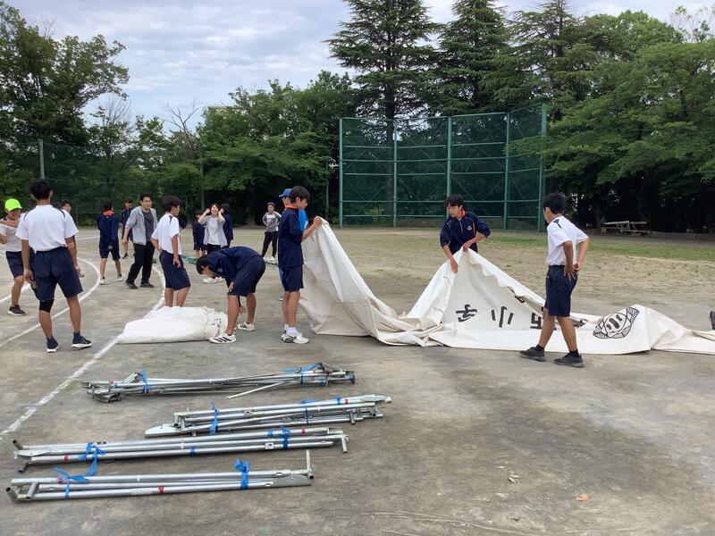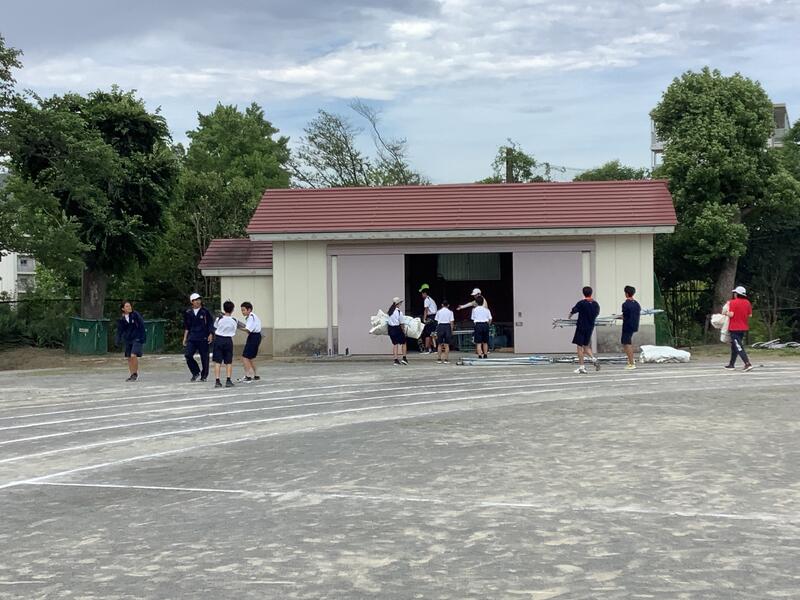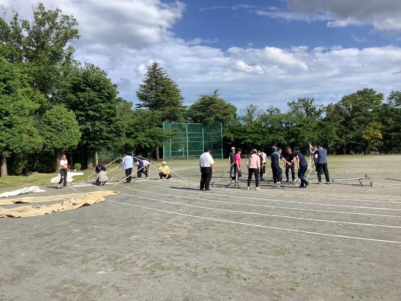 講師の先生方に指導をお願いして生徒が地域未来塾で学習に励んでいる間、教員は職員会議と生徒席のテント張りを行いました。当日は、生徒席全てにテントが張られる予定です。