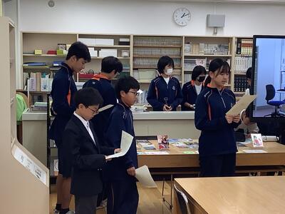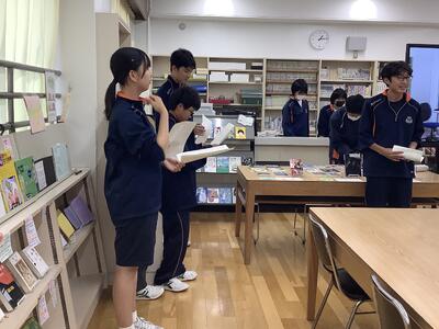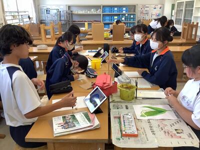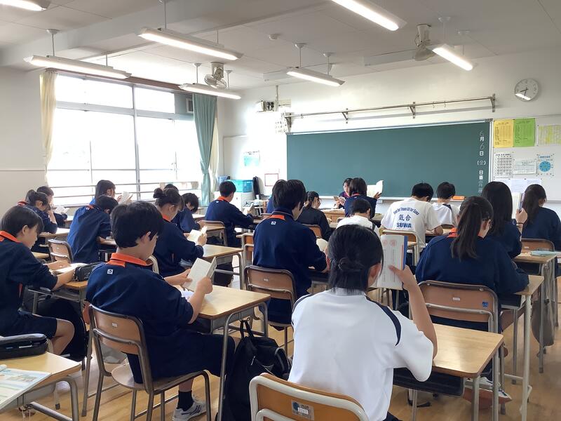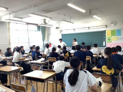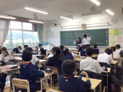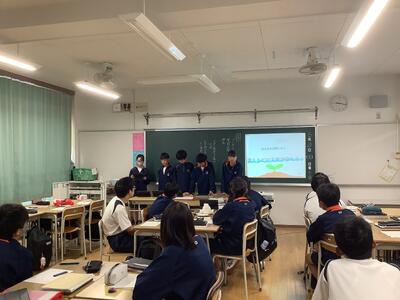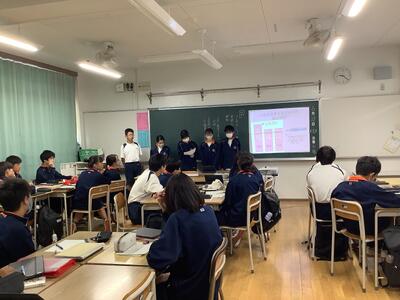2年生の授業です。魅力的な提案の方法について学ぶことを目標に、班ごとに全体に向けてプレゼンテーションが行われました。まず、①アンケートをとり、②それをもとに資料を作成した上で、③練習を行い提案となりました。限られた準備時間の中で、提案までもってくることは大変だったと思いますが、どの班もしっかり仕上げていました。