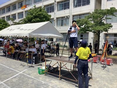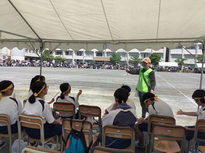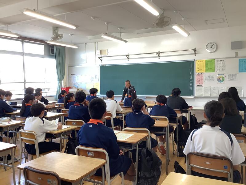 生徒会朝礼では、いつものように各専門委員長から依頼事項や報告がありました。その後、陸上部生徒の表彰、生徒会からのスマイルプロジェクトについてのボランティアの依頼、生活指導部からは不審者が校内に入り込んできた時の対応についての話がありました。朝礼終了後教室に戻ってすぐに、不審者対応の避難訓練を行いました。