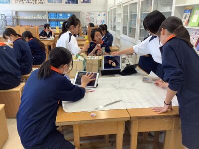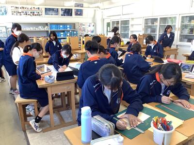 1年生の美術です。モダンテクニックに挑戦しようということで、水彩絵の具を使った様々な技法の学習をしていました(ドリッピング、吹き流し、デカルコマニー)。生徒はお互いの作品を見合いながら楽しげに作品を制作していました。