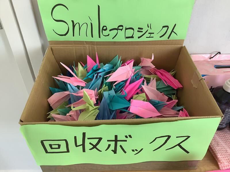 生徒会が主催して行っているスマイルプロジェクト。まず全校生徒ひとり2つずつ折った上で、不足分については、ボランティアとして個人的に折って持って来て欲しいと呼びかけていました。その結果、この度1000羽を超えました。さらに、1500羽まで増やせるよう、折り紙が用意されました。