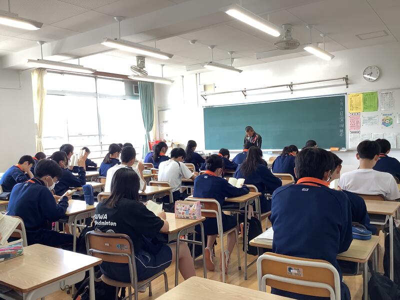 朝の学活では、プリントを使って夏の暑い期間の服装等についての確認がありました。服装以外でも、水筒の持参や栄養補給や睡眠などの健康管理を十分に行って、熱中症にならないように気をつけてもらいたいと思います。