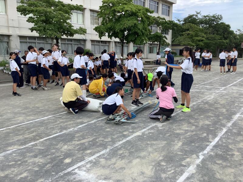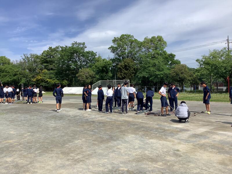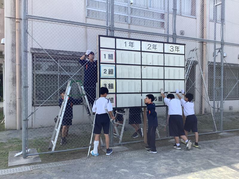 明日の運動会予行に向けて、係ごとの準備が行われました。委員会や部活動単位で集まって、準備が進められていました。また、3年生はムカデの足の調整に余念がありませんでした。