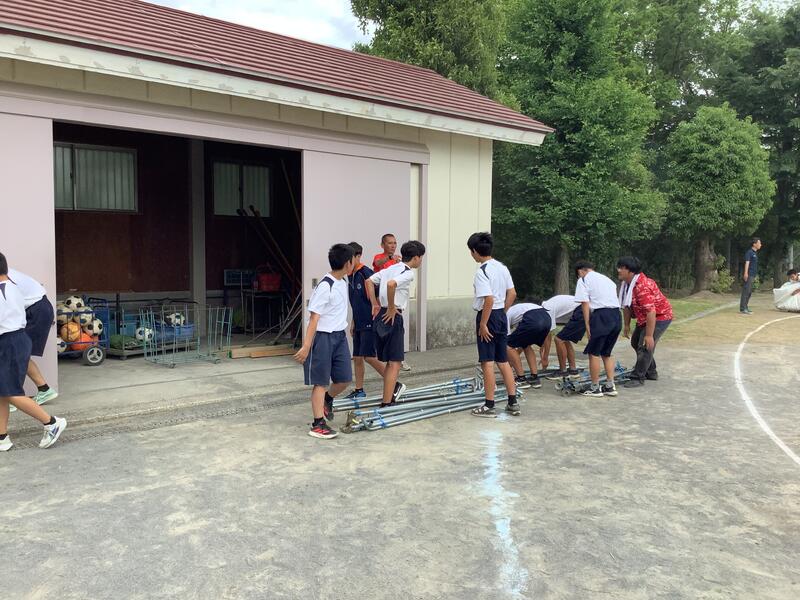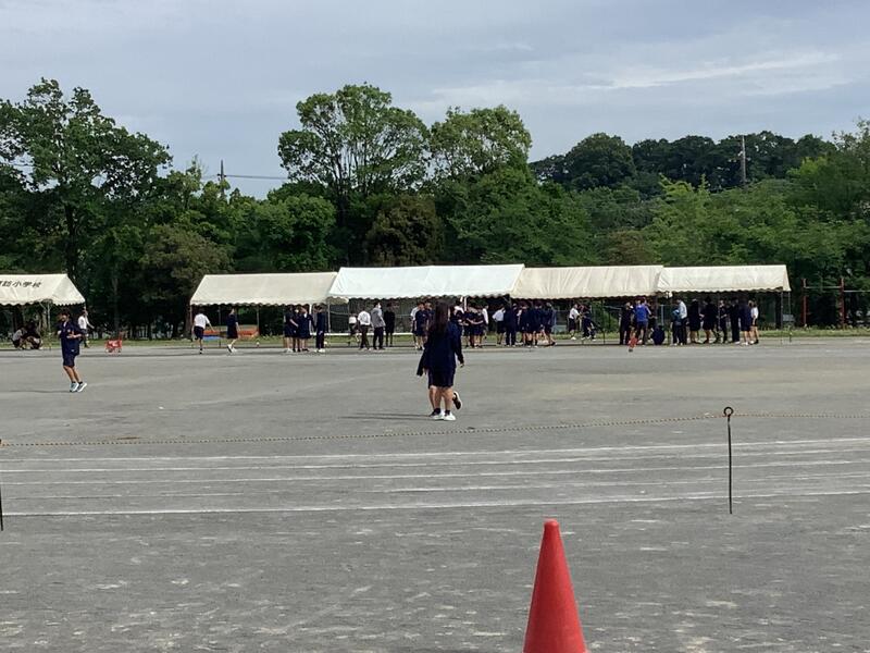 とても水はけがよく校庭も乾いてきていますが、一部水溜りがあったので、先生方が早く来て整備してくれていました。係の生徒も準備のため早く登校してくれました。