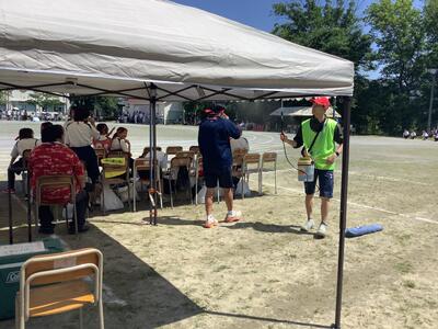 水分補給のための休憩時間をとっています。学生ボランティアの方がミストをかけてくれています。