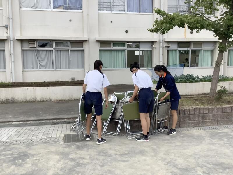 水泳指導に向けて、美化委員会の生徒たちがプール更衣室の清掃を行ってくれました。まずは、更衣室に入れられていたものが次々に外に運び出されていました。