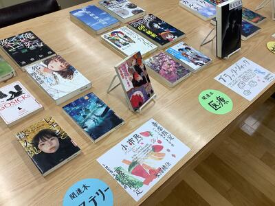 昼休みに図書委員会による「メディア化小説紹介」が実施され、映画やアニメ化された作品の原作や、それに関連した作品を図書委員が選んで紹介していました。ポップも上手に描かれていて、作品への興味が湧いてきました。