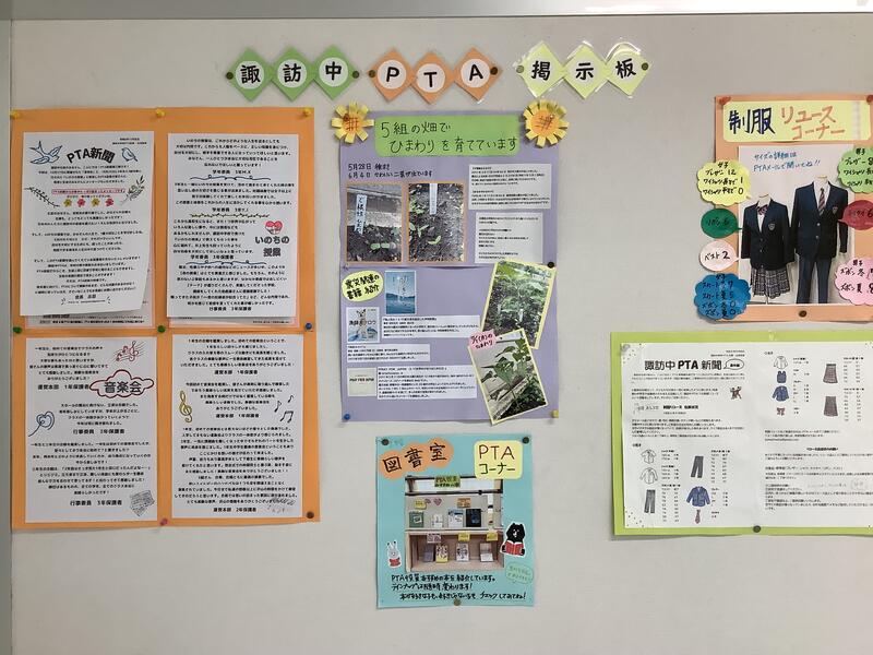 これまでPTA室前の掲示板に貼ってあったPTA関連の掲示物を1階の廊下に移しました。これまでは、4階の1番奥にあったため目につきにくくなっていましたが、今回の変更によって、より多くの方々に見ていただくことができるのではないかと思います。今回、原稿をお寄せいただいた保護者の皆様、どうもありがとうございました。