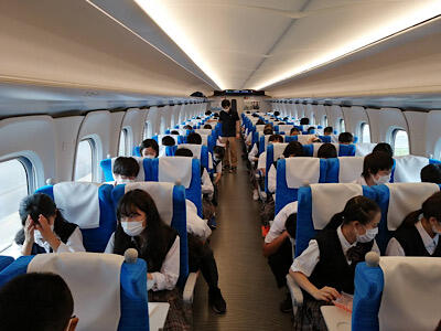 新横浜で出発式を行い、いよいよ新幹線に乗り込みます。実行委員からは、感染対策に気をつけよう。あいさつをしっかりしよう。などの話がありました。