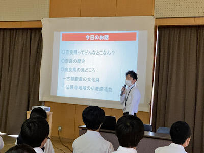 3年生は修学旅行に向けて、奈良観光協会の方から奈良の見どころについてのお話を聞きました。「奈良にはどんなお寺がありますか?」「東大寺!」「法隆寺!」「金閣寺!」...「えーっ!」大爆笑の一場面でした。しっかり事前学習しましょう。