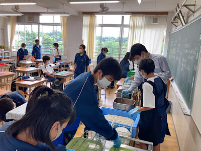 1年生で来週から行われる「給食準備グランプリ(仮称)」に向け、自分たちで時間を計りながら準備しています。配膳が早くなると、ゆっくり食べることができますね。