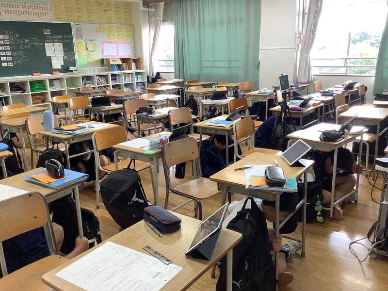今日は津波防災の日です。市内では防災放送により、訓練放送が流れましたが、本校ではこれに合わせて避難訓練を行いました。授業中でしたが、10時の多摩市の防災放送と同時に校内放送を入れ、大きな地震がきた想定での訓練行動を確認しました。生徒は、放送や授業担当の教員の指示をよく聞いて、素早く行動に移していました。