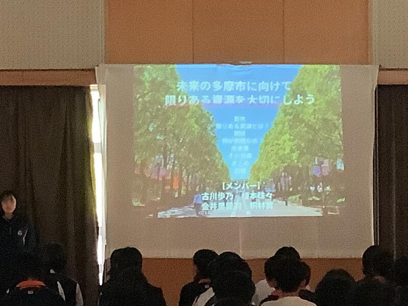 5日に行われたグループ内の発表で選ばれた代表グループが、学年全体の前で発表を行いました。どのグループも、工夫されたスライドを用いて、堂々とした態度でわかりやすく伝えることができていました。発表においては、SDGsの17の目標のうちのひとつを選び、深く探究し、しっかりと考察を行った上で、多摩市への提言や学年への呼びかけがなされていました。