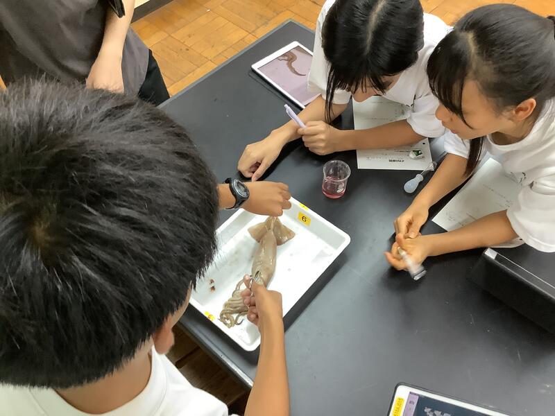 また、1年生の理科の授業では、イカの解剖の実験が行われていました。最初のうちは、なかなか思うように作業ができませんでしたが、徐々に慣れ、後半は手際良く実験が進められました。実習を通して学びを深める生徒の様子が多数見られ、成果を感じられる時間となりました。