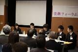 4月4日(土)午後、関戸公民館の会場にせいせき桜まつりのサブイベントとして復興フォーラムが開催されされました。東日本大震災で被災された岩手県立釜石高等学校の生徒2名と先生を招き、市内中学校3校の代表が地域防災についてディベートをしました。本校からは生徒役員の馬場俊君、須藤竜威君の2名がディベートに参加して、昨年本校で行われた避難所宿泊体験訓練や地域でのボランティア活動について発表し、災害時に中学生が地域で貢献することの大切さについて話し合いました。