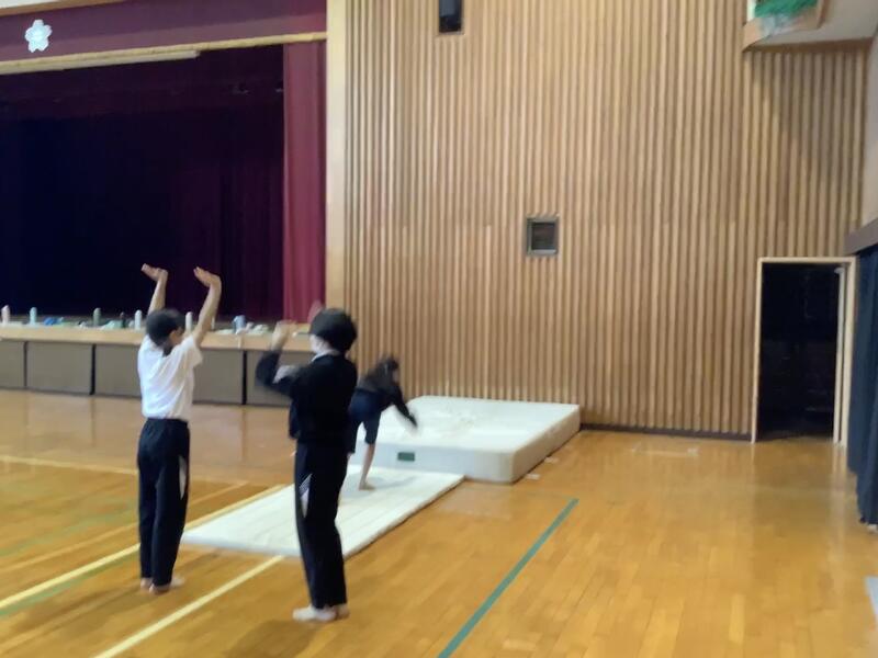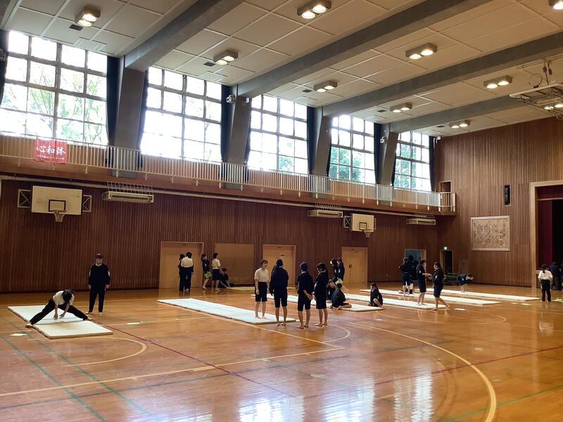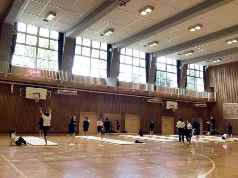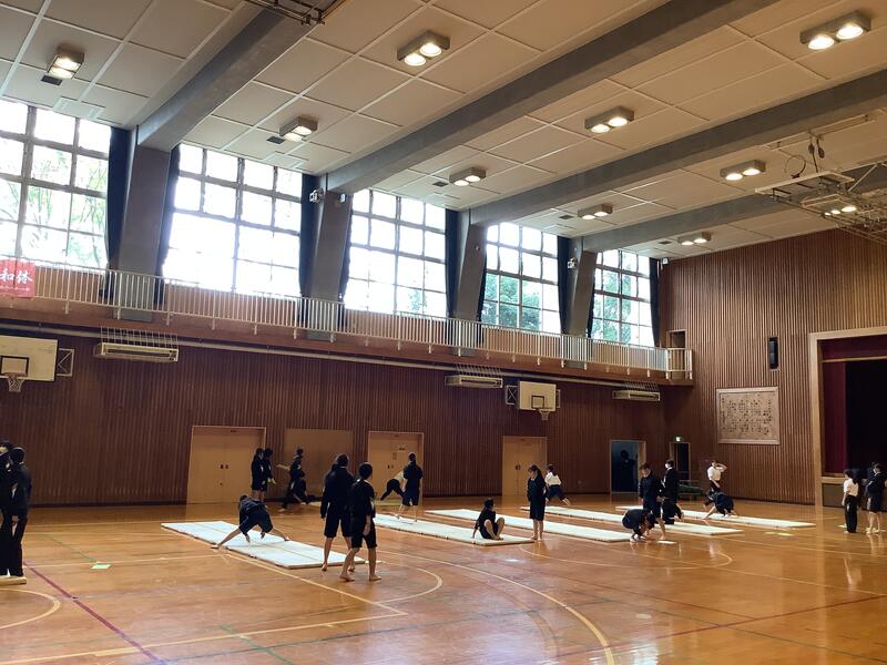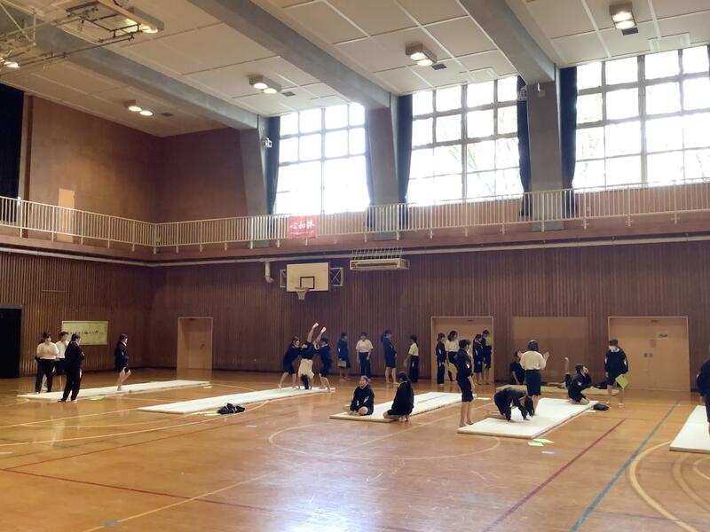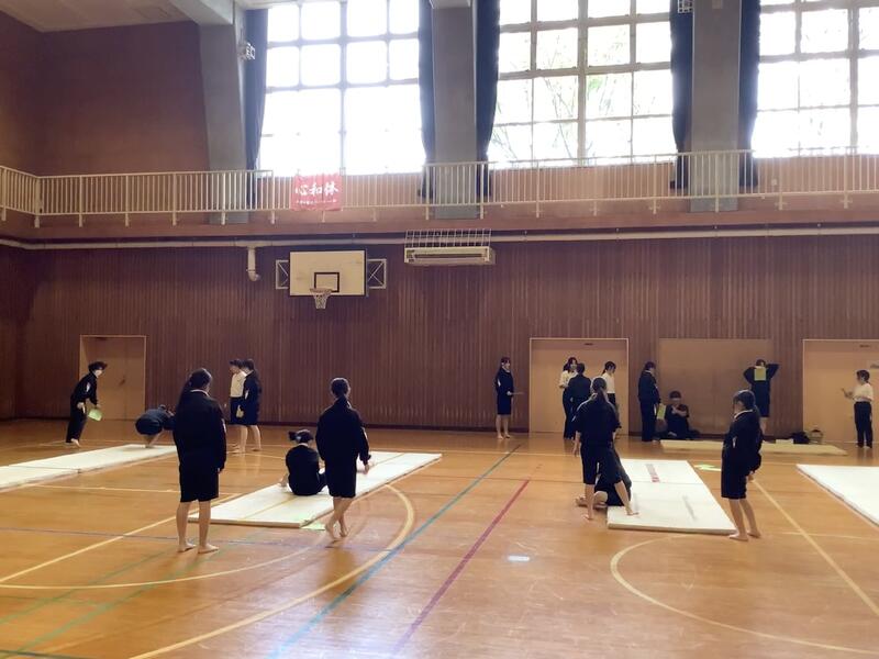 また、2年生の保健体育の授業では器械運動の学習が行われていました。具体的にはマット運動に関する様々な技を練習し、完成のチェックを受けていました。お互い教え合ったり、支え合いながら頑張って練習に取り組んでいました。
