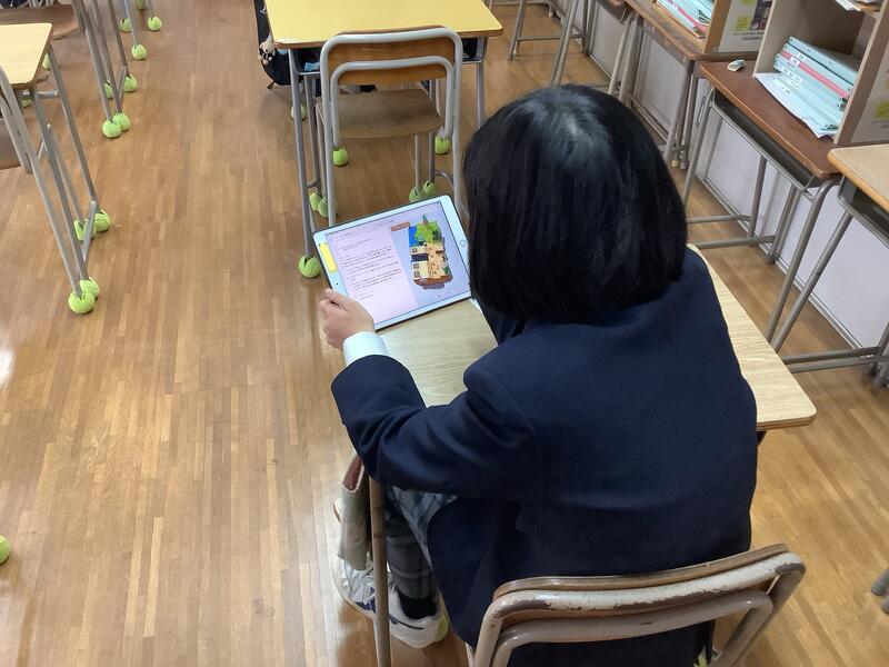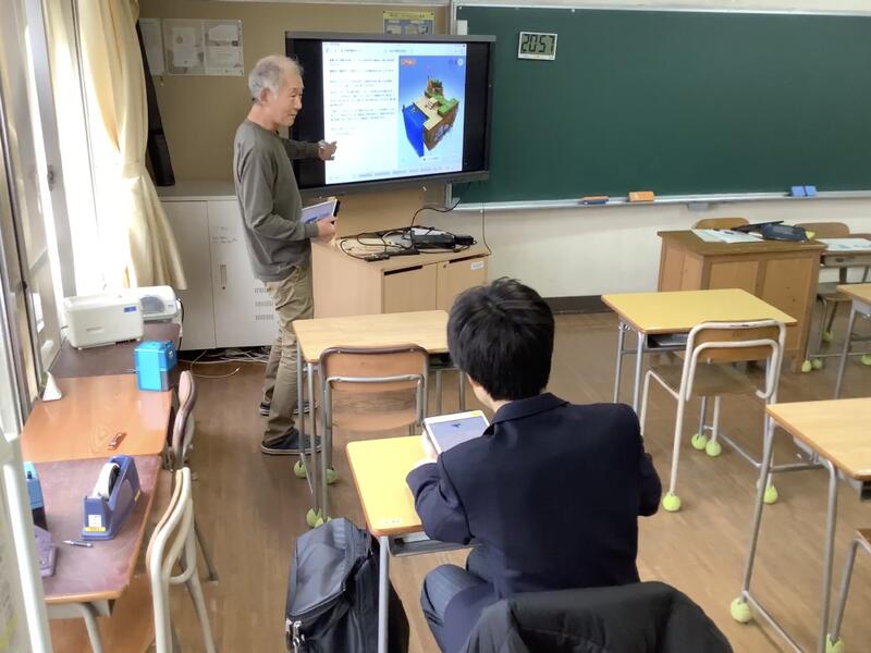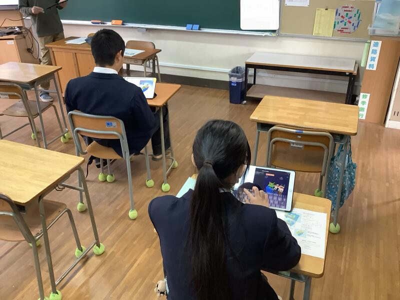 また、1年生の英語の授業では一般動詞の疑問文に関する学習が行われていました。後半はグループワークにより、お互い質問しながら正解を当てるゲーム形式の学習を通して理解を深めていました。