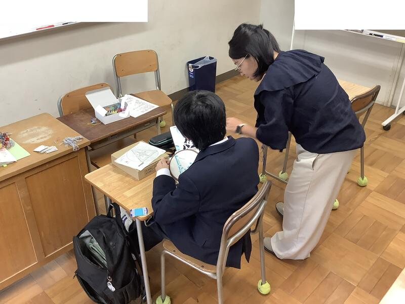 また、1年生の数学の授業では比例や反比例に関する学習に取り組んでいました。比例や反比例の関係を式で表したり、グラフを書いたりしました。それぞれの特徴を理解しながらお互い教え合い、数学的な活動に一生懸命に取り組んでいました。
