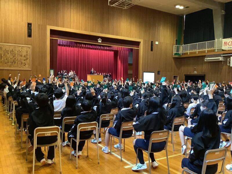 今日は、生徒総会が行われました。生徒会本部や各委員会から活動方針が示され、質問については回答が述べられました。その後、活動方針が承認されました。内容を分かりやすくしっかりと発表する姿はとても立派でした。