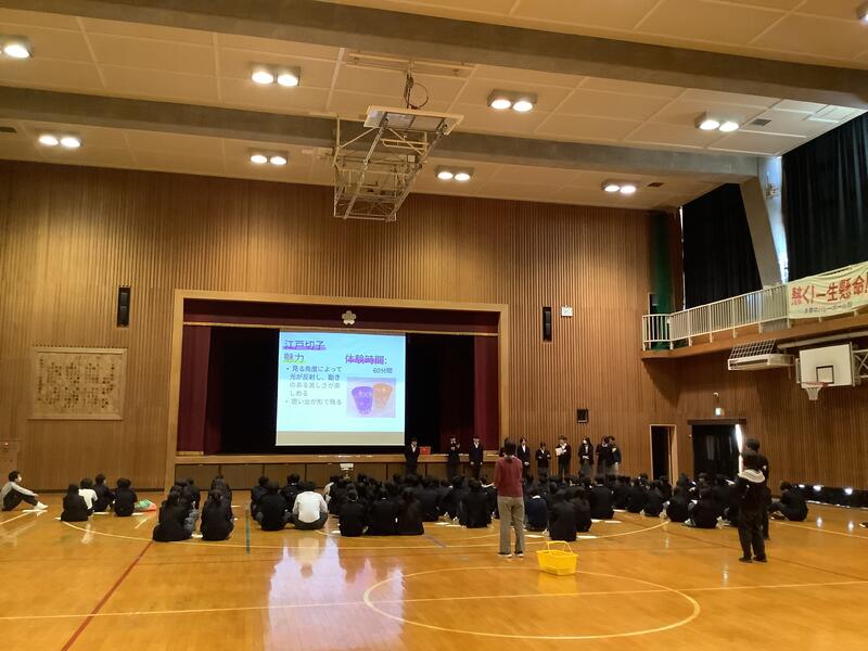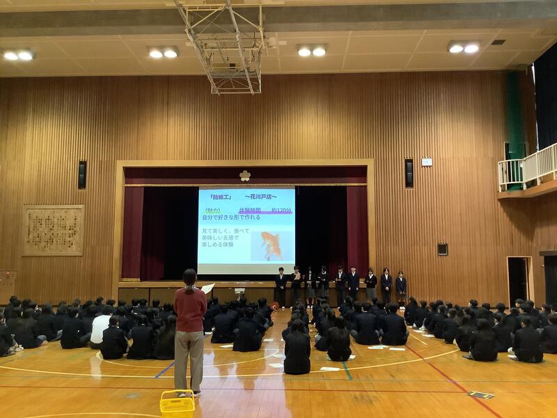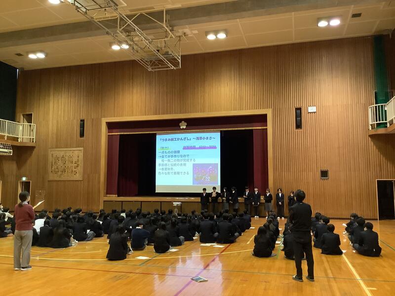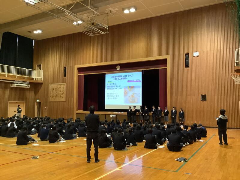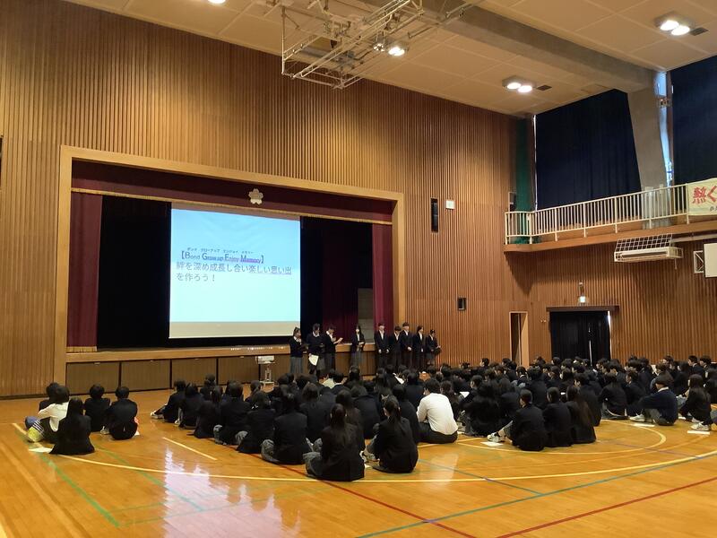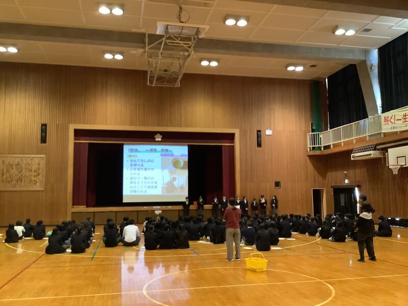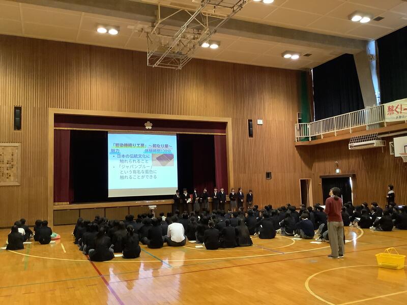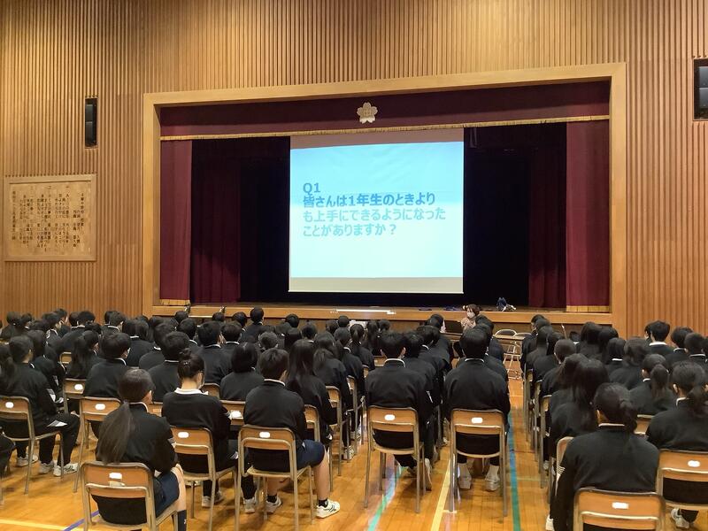 1年生は、7月に実施した伝統文化継承会のまとめを行い、各クラスでそれぞれ発表しました。今日は各クラスから選出された代表生徒による学年発表会を体育館で実施しました。どのような学びに取り組んだのか、実生活とどのように結び付いているのか、SDGsとの関連性などについて調べたことや考えたことを発表しました。とても素晴らしいプレゼンでした。