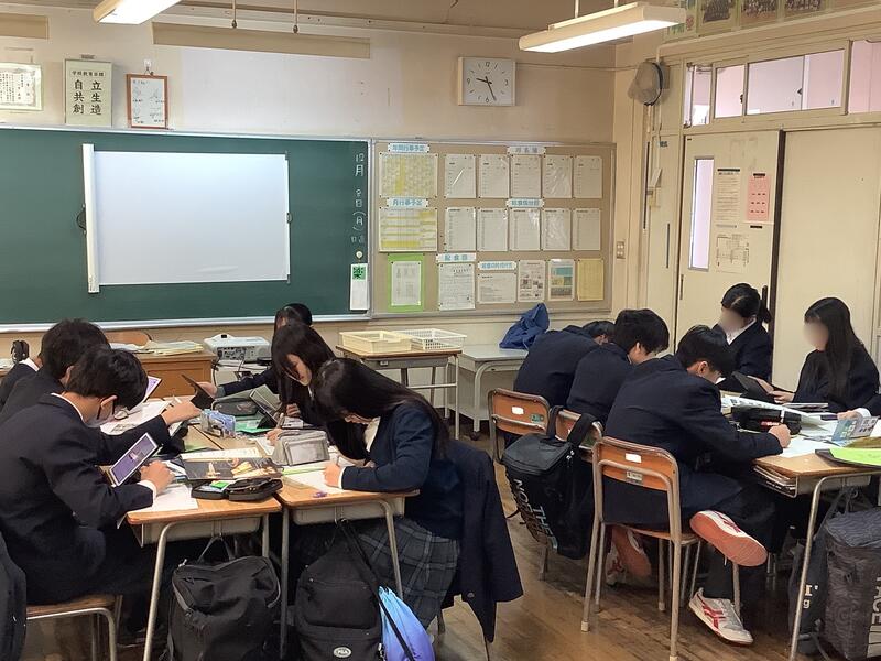 また、1年生の英語の授業では一般動詞の疑問文に関する学習が行われていました。後半はグループワークにより、お互い質問しながら正解を当てるゲーム形式の学習を通して理解を深めていました。