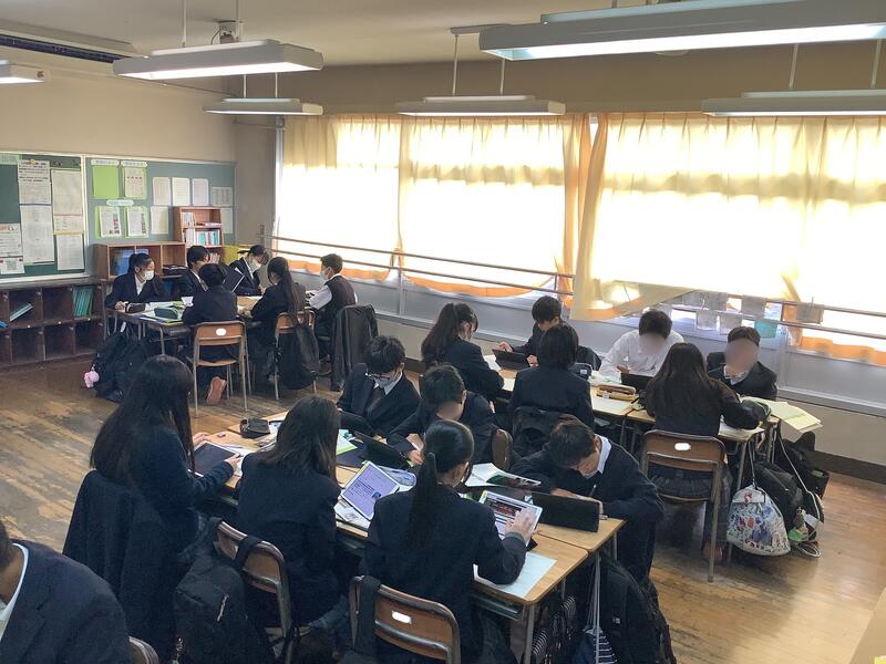 数学では、一次関数の学び合い活動で理解を深めていました。ここでも協働的な学びが進められています。