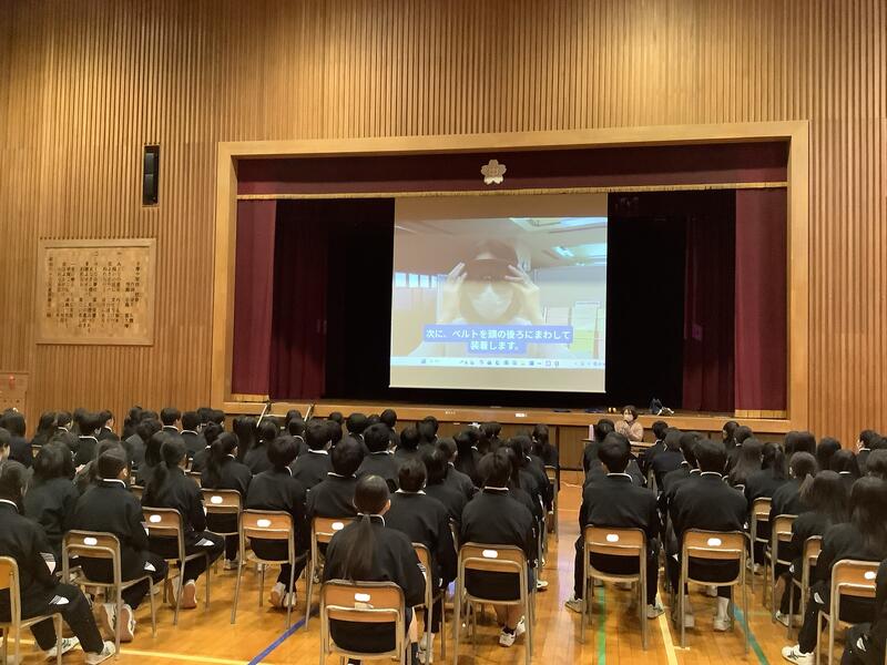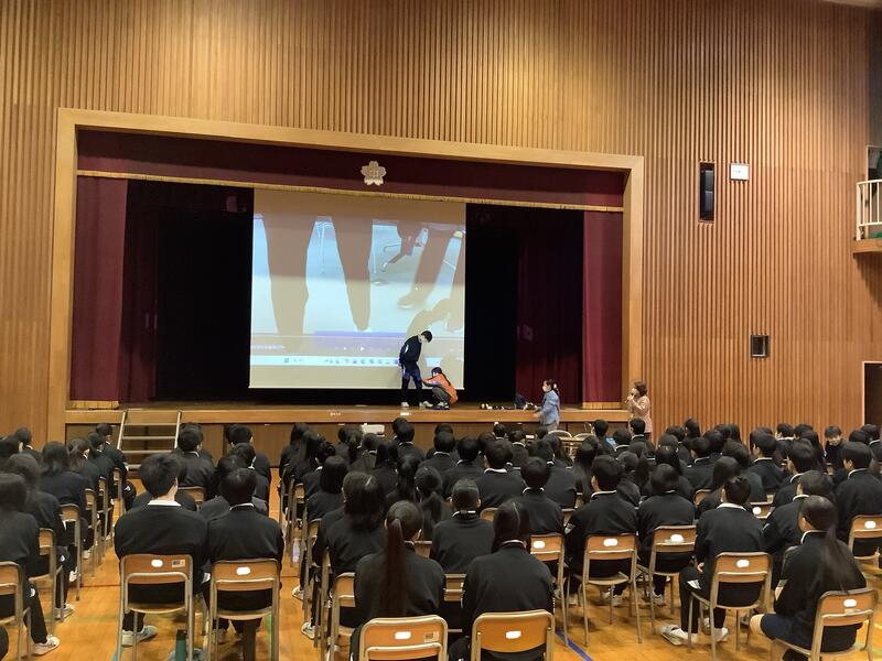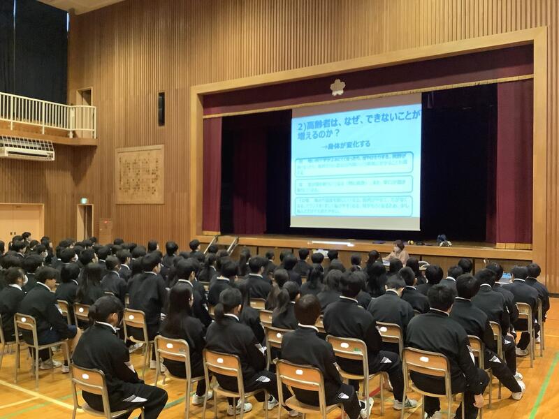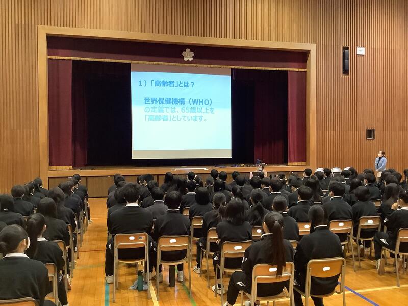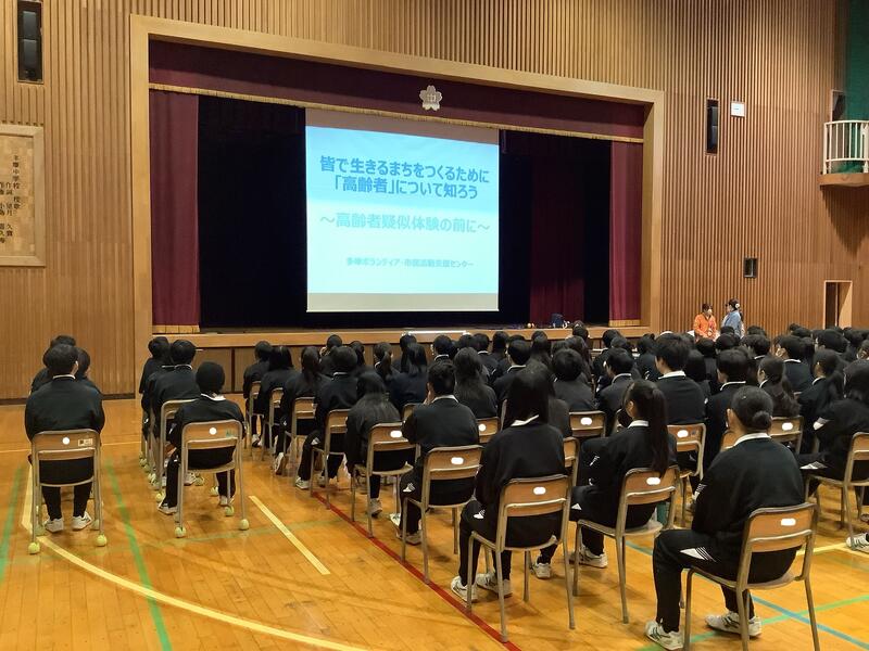 今日の1校時、2年生は高齢者体験学習を実施しました。多摩市社会福祉協議会事務局の皆様を講師として迎え、映像も交えながら高齢者に関するお話をいただきました。途中では、各クラスの代表生徒による高齢者擬似体験セットの着用を通して理解を深める場面も設けられました。来週の水曜日には防災デイキャンプが行われる予定であり、その時には全員が高齢者擬似体験セットを着用します。来週に向けて事前準備を行うことができました。