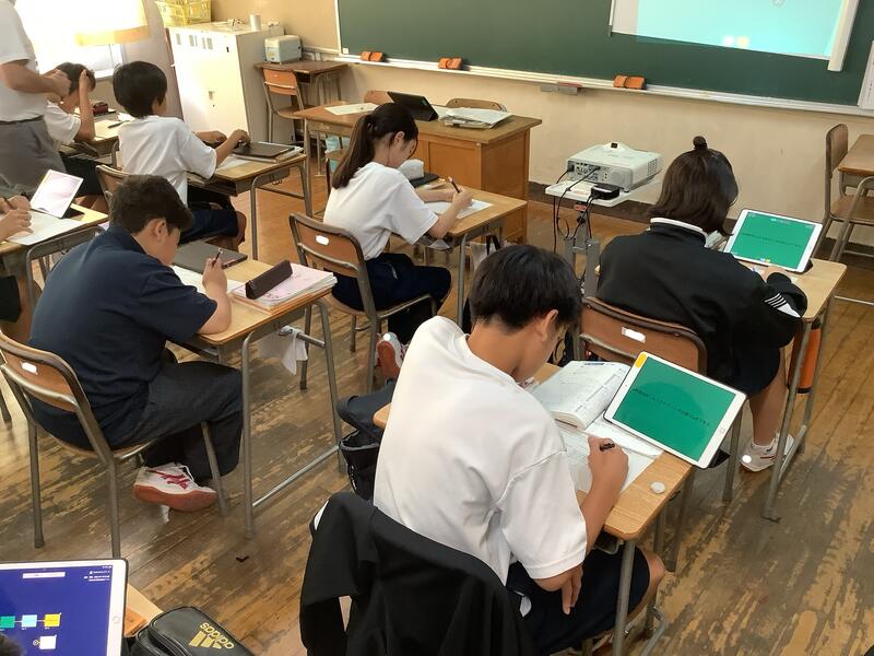 さて、1年生の数学では比例と反比例の導入の授業が行われていました。時間と水の深さとの間には一定の関係があることに着目して問題を解いていました。多様な考え方があることも知ることができました。