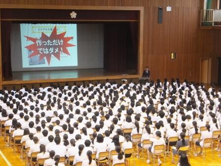 7月9日(土)5時間目、体育館で全校生徒と保護者、地域の方を対象にセーフティ教室を開催しました。講師にKDDIの松岡さんをお招きして、「スマホ・ケータイでのトラブル・個人情報」をテーマに具体的なトラブル、犯罪事例などを紹介していただきました。また、「自分の軽率な行為がどのようなことを引き起こすのか」「事前の対策はどのようにすればよいか」など指導いただきました。全校生徒を代表して、生徒会長の土井琉志亜さんからお礼のことがありました。