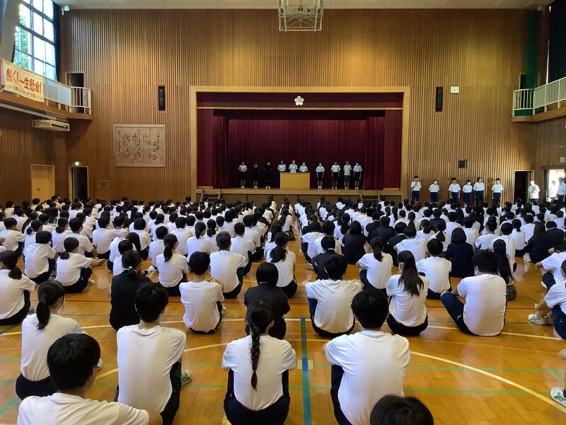 今学期最初の全校朝礼が行われました。生徒はしっかりと前を向き、きちんと集中して話を聞けていました。講話では、まずは自分を活かせる場面で力を発揮していこうということ。そして、その中で、集団の成長と自らの成長のために、今自分ができることは何かを考えて、自ら主体的に行動してほしいと話しました。