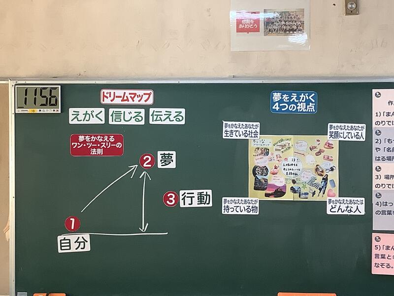 一年生のキャリア教育の一環として、講師の方々に来ていただいて「ドリームマップ」の作成を行いました。まず、講師の方から夢に対する考え方やマップの作成方法について学びました。その後は、それぞれに今自分が興味を持っていることや好きなことを中心にして、写真などを使いながら自らのドリームマップを仕上げました。