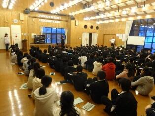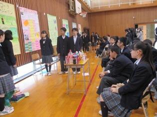 3月12日(金)5時間目に1学年の生徒が体育館で、11月に実施した職場訪問の発表会を行いました。訪問先で伺った話や質問した内容とその回答、体験した内容等を原稿にまとめ、クイズや実演などで構成しました。各班とも、7分間の持ち時間いっぱい、元気に発表しました。発表していない時は、他の班の発表を見学し、興味のある事業所について、お互いに学ぶことができました。