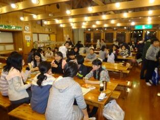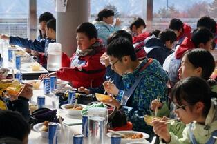 朝の気温はマイナス10℃で凍てつく寒さでしたが、午前中は雲一つない快晴で、積雪、雪質ともによく、絶好のコンディションでスキー実習ができました。昨日はあまりうまく滑れなかった人も今日はリフトに乗って少し急な斜面も滑ることができるようになりました。午前・午後の実習5時間半で力を出し切った心地よい疲労感と満足感で宿舎に戻ってきました。