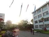 多摩中生徒会では、季節感のある日本の伝統・文化を継承するために、こいのぼりプロジェクトを行っています。生徒会役員が本校舎と特別棟の間にこいのぼりをロープでつなぎ、こどもの日まで、こいのぼりは青い空を元気よく泳いでいます。