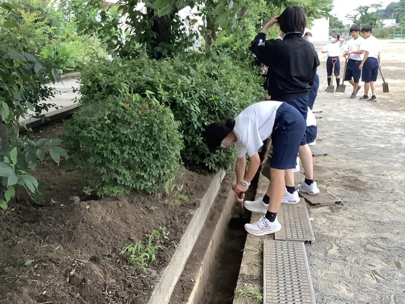 校庭の側溝が土で埋まり、排水が悪くなっていることから、ボランティアを募って土の掘り出しを行いました。生徒会の本部や女子バスケットボール部の生徒など、全部で16人もの生徒が集まってくれました。 みんなのために、どうもありがとう!